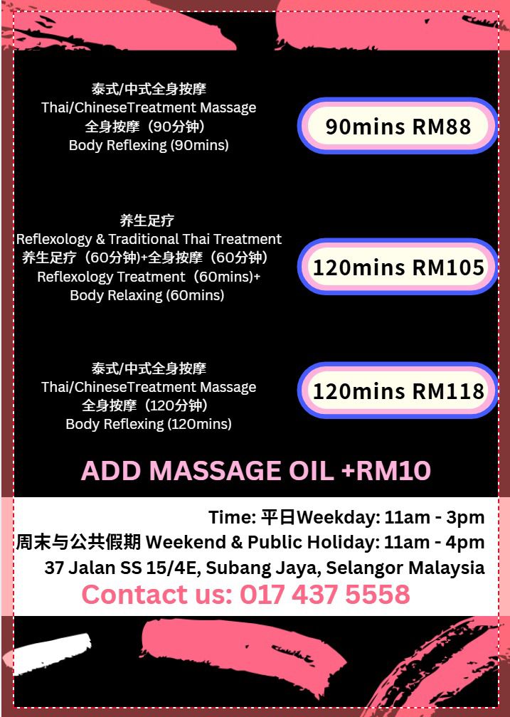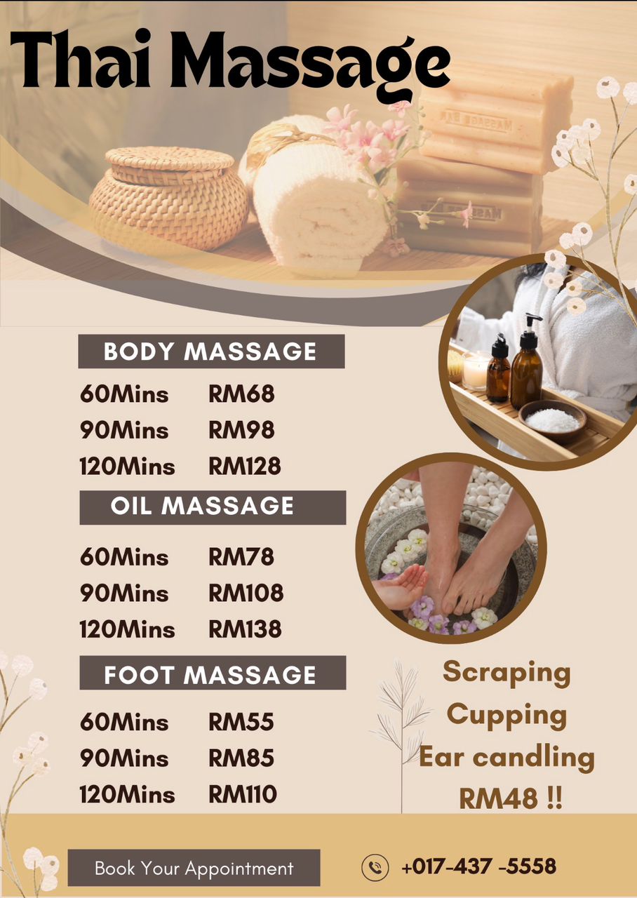EXCELLENT Based on 38 reviews Posted on Jing Lung YeoTrustindex verifies that the original source of the review is Google. Good message,will come againPosted on Priscilla SalveenTrustindex verifies that the original source of the review is Google. Hmm, was misled by the reviews. Yes price was reasonable. However they can certainly improve on the following: 1. The water they soak your feet in was cold 2. Both the masseuse were chatting to each other 3. They were also distracted by their phones, constantly checking the phones and one even answered a video call. 4. Massage in general was just average. Definitely not a Thai Massage and needs improvement. 5. There was even a customer who said he was there the previous week didnt think the masseuse was very good. 6. At the end when the wipe the feet the towels are cold wet. Sloppy servicePosted on lee jan mingTrustindex verifies that the original source of the review is Google. Good and friendly staff. Very experienced. Good place to get a body massagePosted on Mekawathi RamalingamTrustindex verifies that the original source of the review is Google. Highly recommend. Well experienced therapist.Posted on sathya ganeshiniTrustindex verifies that the original source of the review is Google. I had a very good experience at the Thai massage. The place was clean, the therapist was skilled, and I left feeling very relaxed. Highly recommended.Posted on Vithya RubbiniTrustindex verifies that the original source of the review is Google. Nice and cosy place with good hospitality.Posted on manpreet singhTrustindex verifies that the original source of the review is Google. Good and cheap message service. Highly recommendedPosted on JLHoTrustindex verifies that the original source of the review is Google. 这家按摩店真的太棒了!环境舒服,技师手法超放松,服务也特别贴心,下次还想再来! This massage place is awesome! The vibe is super relaxing, and the therapists really know how to work out the stress. The service is friendly and caring too. I’ll definitely come back again!Verified by TrustindexTrustindex verified badge is the Universal Symbol of Trust. Only the greatest companies can get the verified badge who has a review score above 4.5, based on customer reviews over the past 12 months. Read more